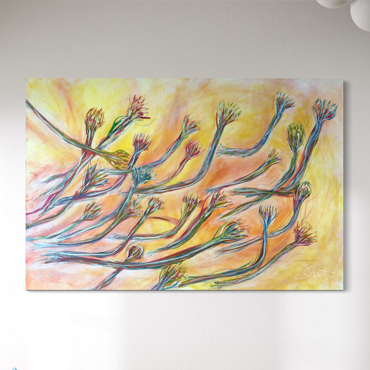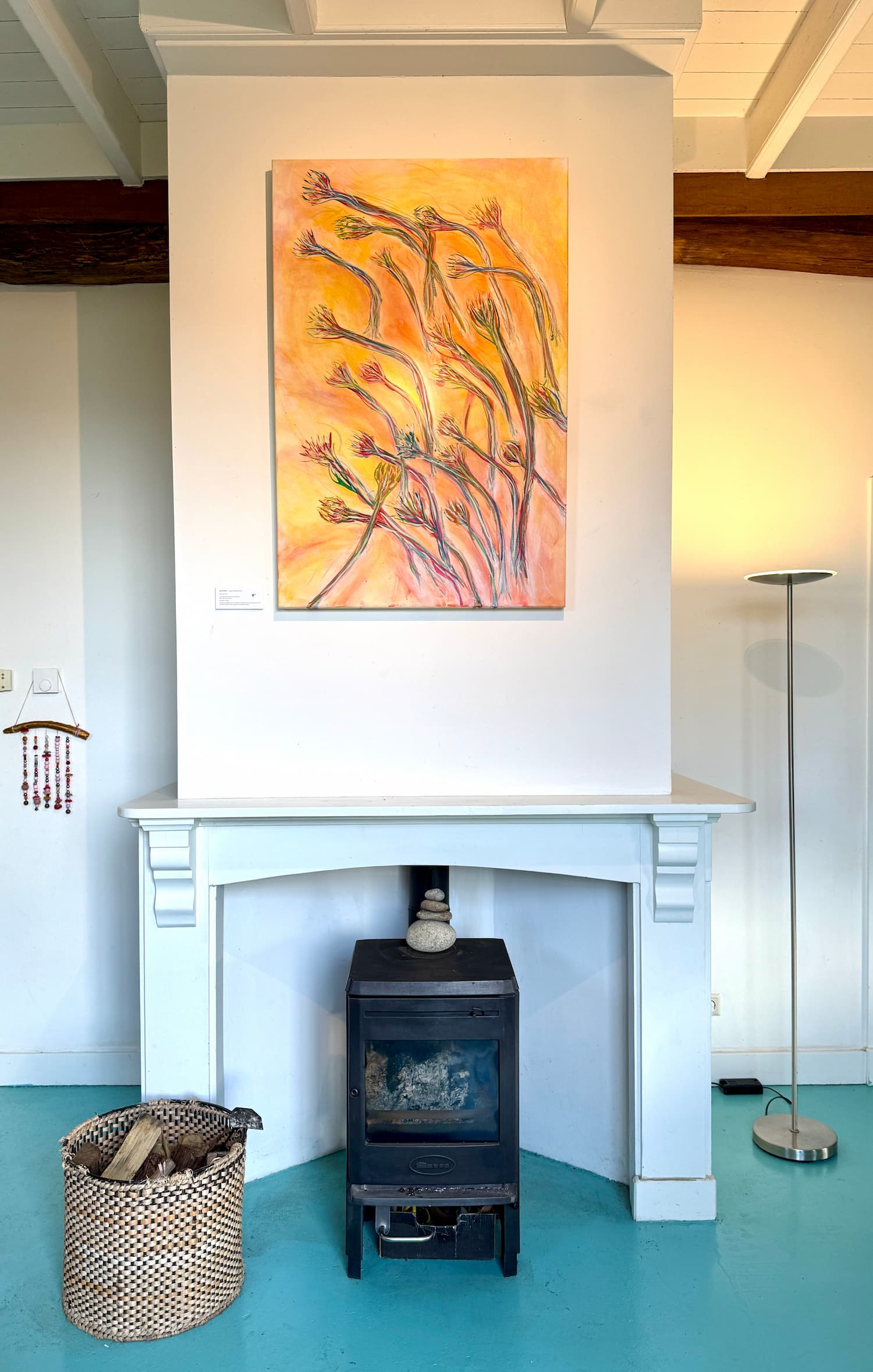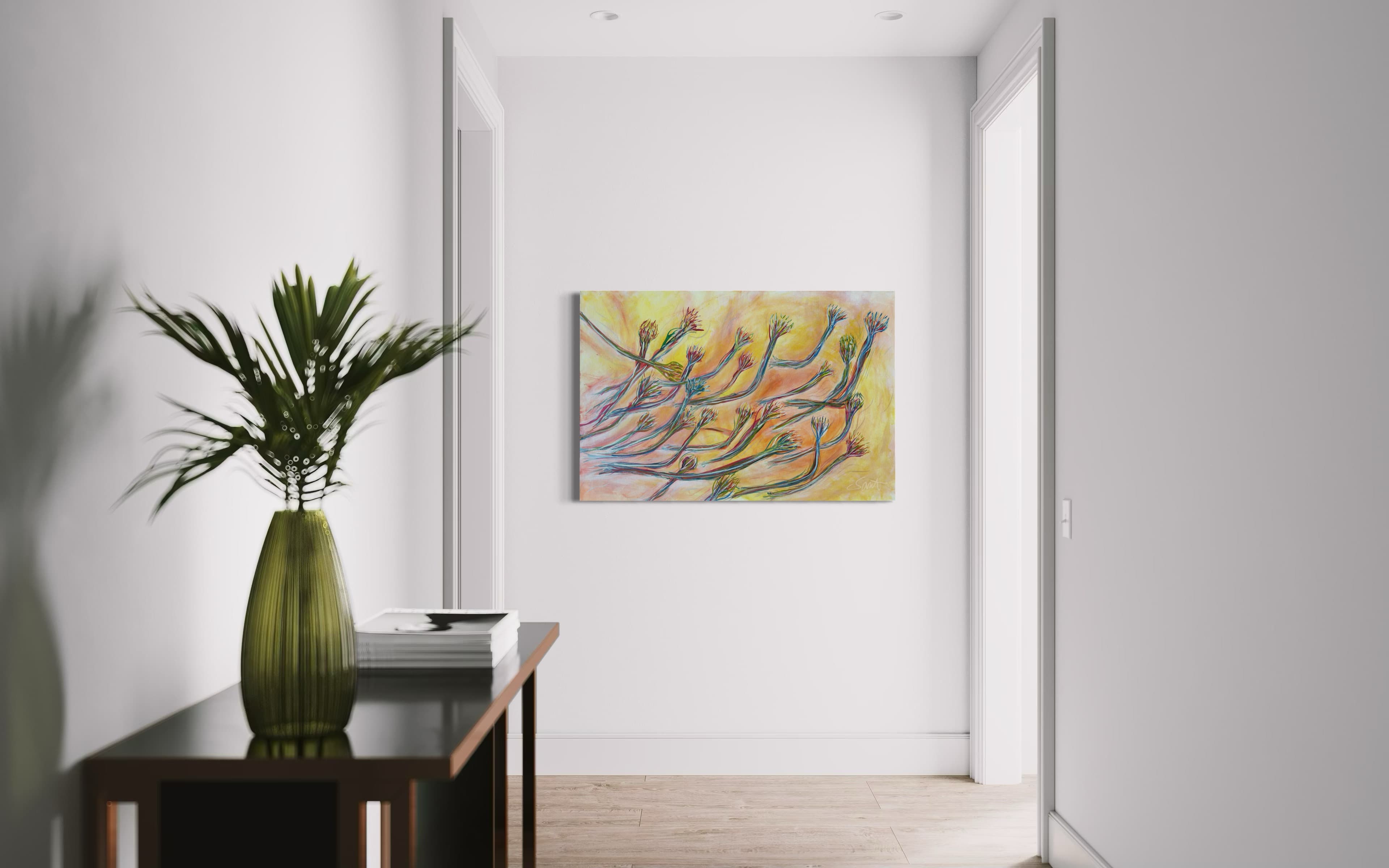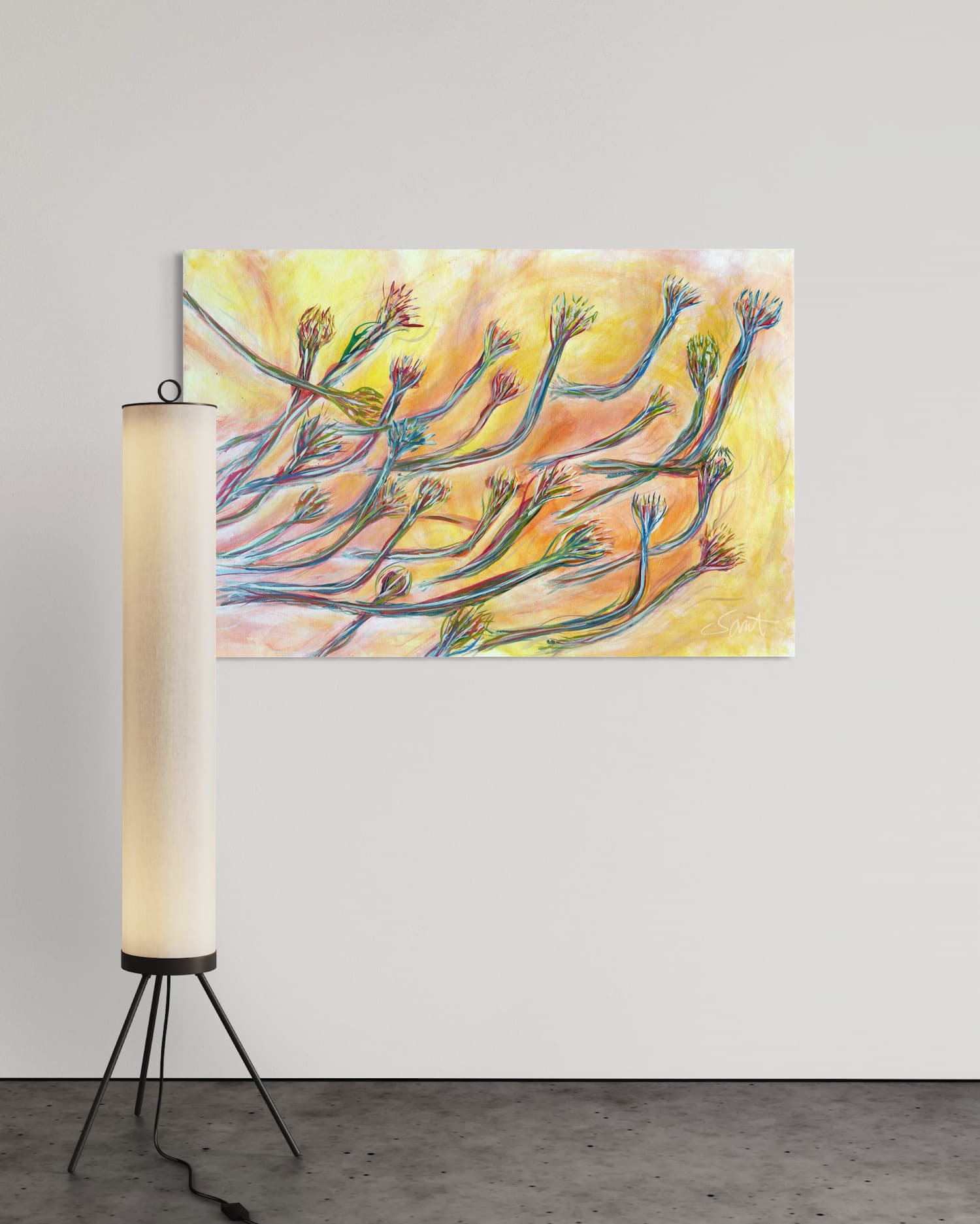 Lichte zwevende tinten in wit, zachtroze en zilvergrijs. De vormen waaien uiteen als zaden in de lucht, vergelijk het met een vlucht van vogels. De achtergrond is zonnig, een ruimte van vrijheid tussen aarde en hemel.