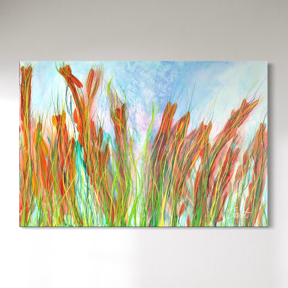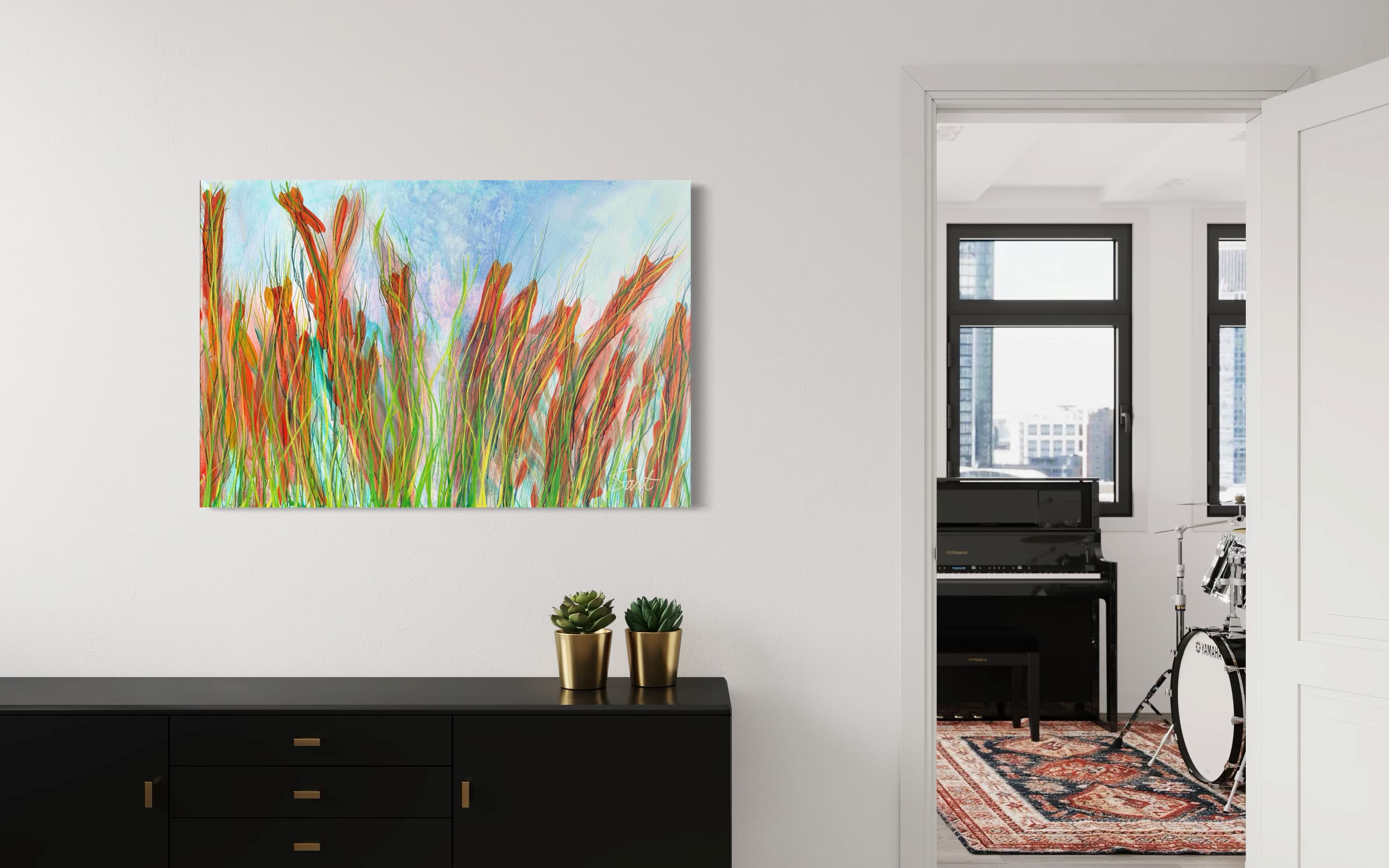 Diep rood en frisgroen in snelle, impulsieve penseelstreken. De verf lijkt te breken, barstjes waaruit energie ontsnapt. Een beweging van gezonde spanning én ontspanning, op weg naar...