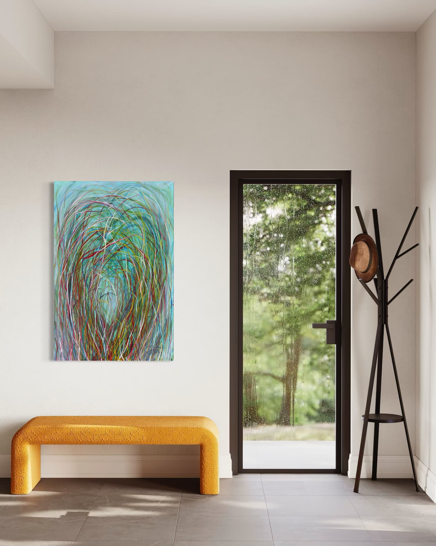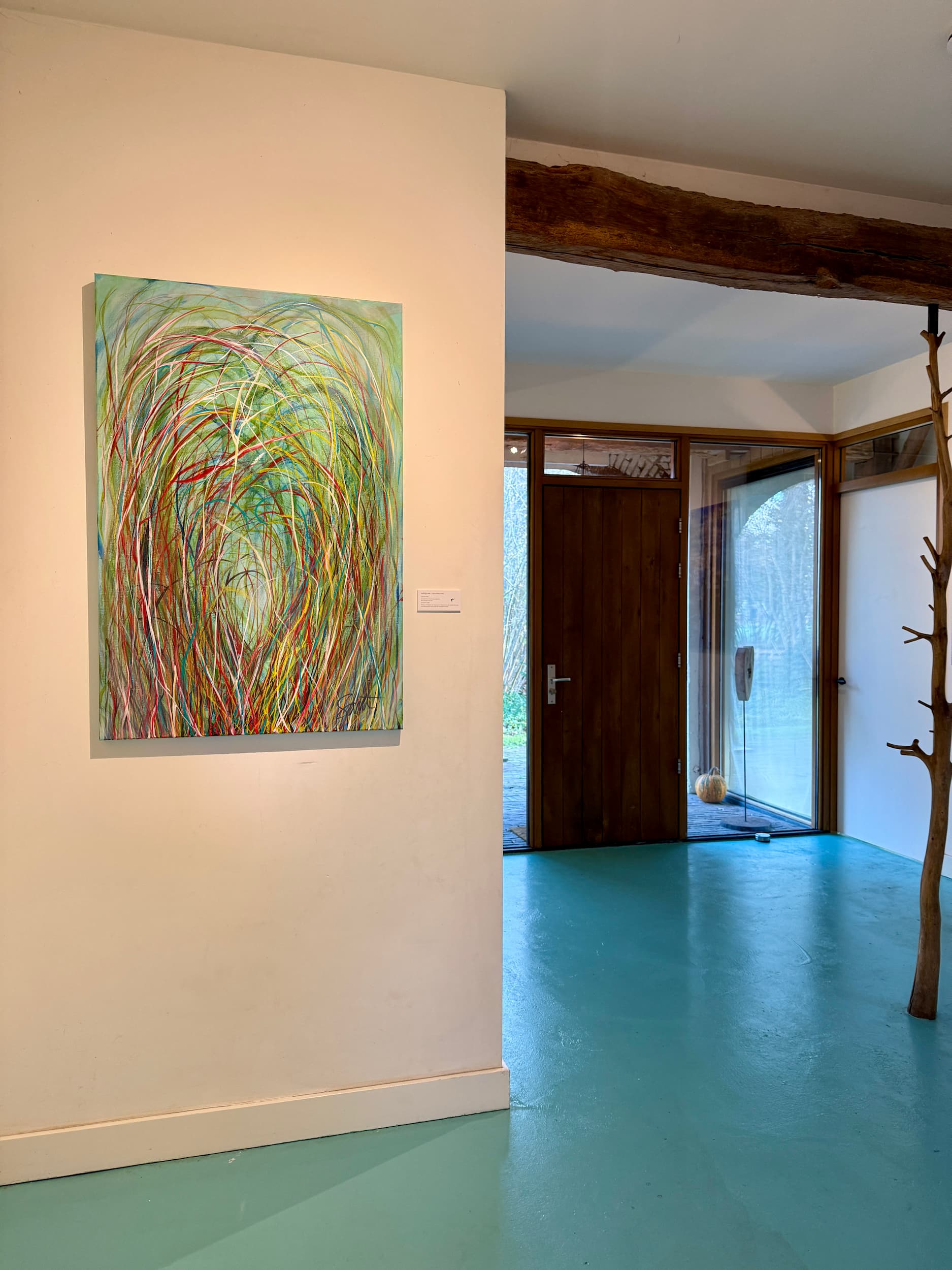 Een explosie van kleur: roden, groenen, okers en roze trekken alle kanten op. De lijnen kruisen, verdringen, versterken elkaar. Geen compositie die wil beheersen. Het doek ademt vrijheid, vitaliteit, overdaad. Het ‘doet maar wat’.